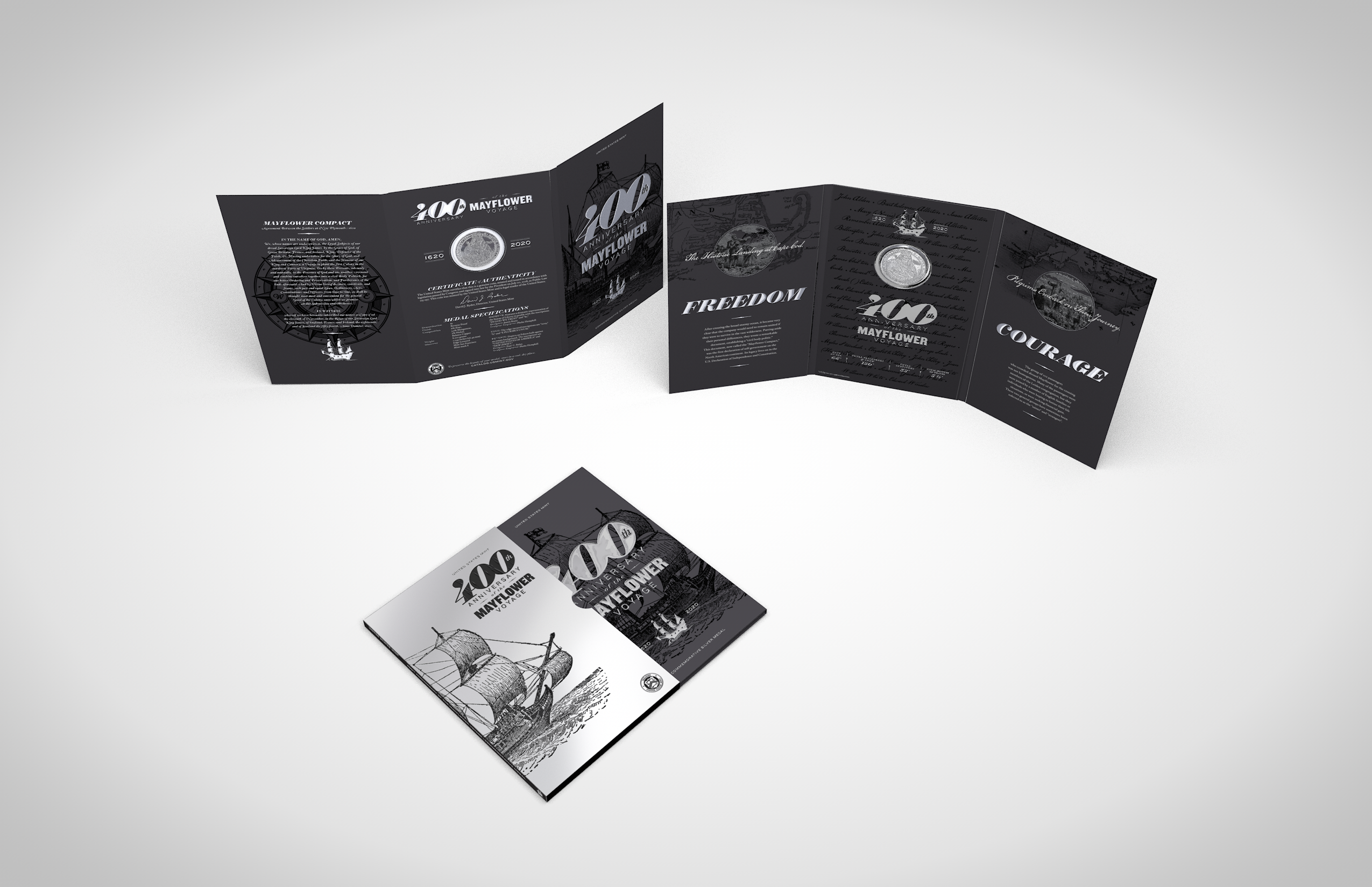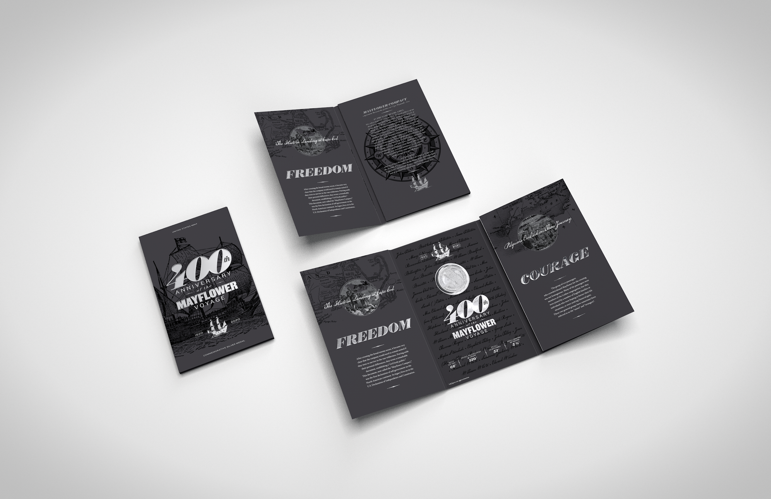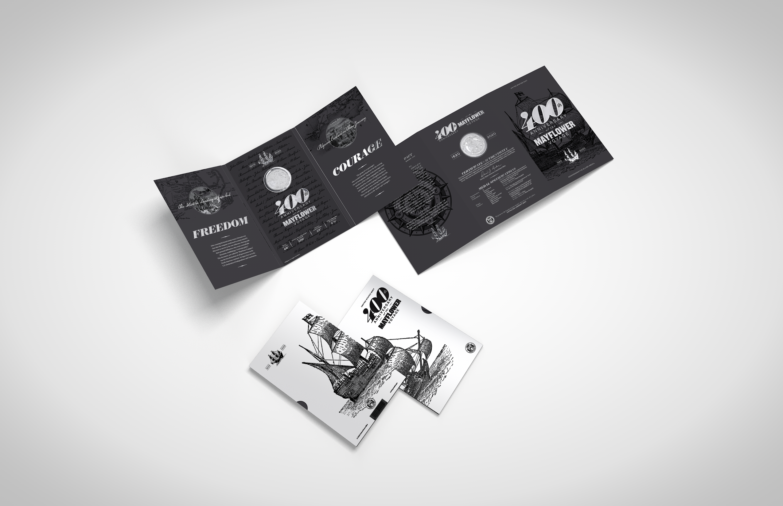 Phylum contacted Andon Guenther Design in 2019 to produce a coinfolio commemorating the 400th Anniversary of The Mayflower. We went back and forth on a few variations and ended with what you see below. This project was a lot of fun, and educational, as we re-learned all there is to know about the ship and the historical voyage, and used elements from our learnings in the final production piece.