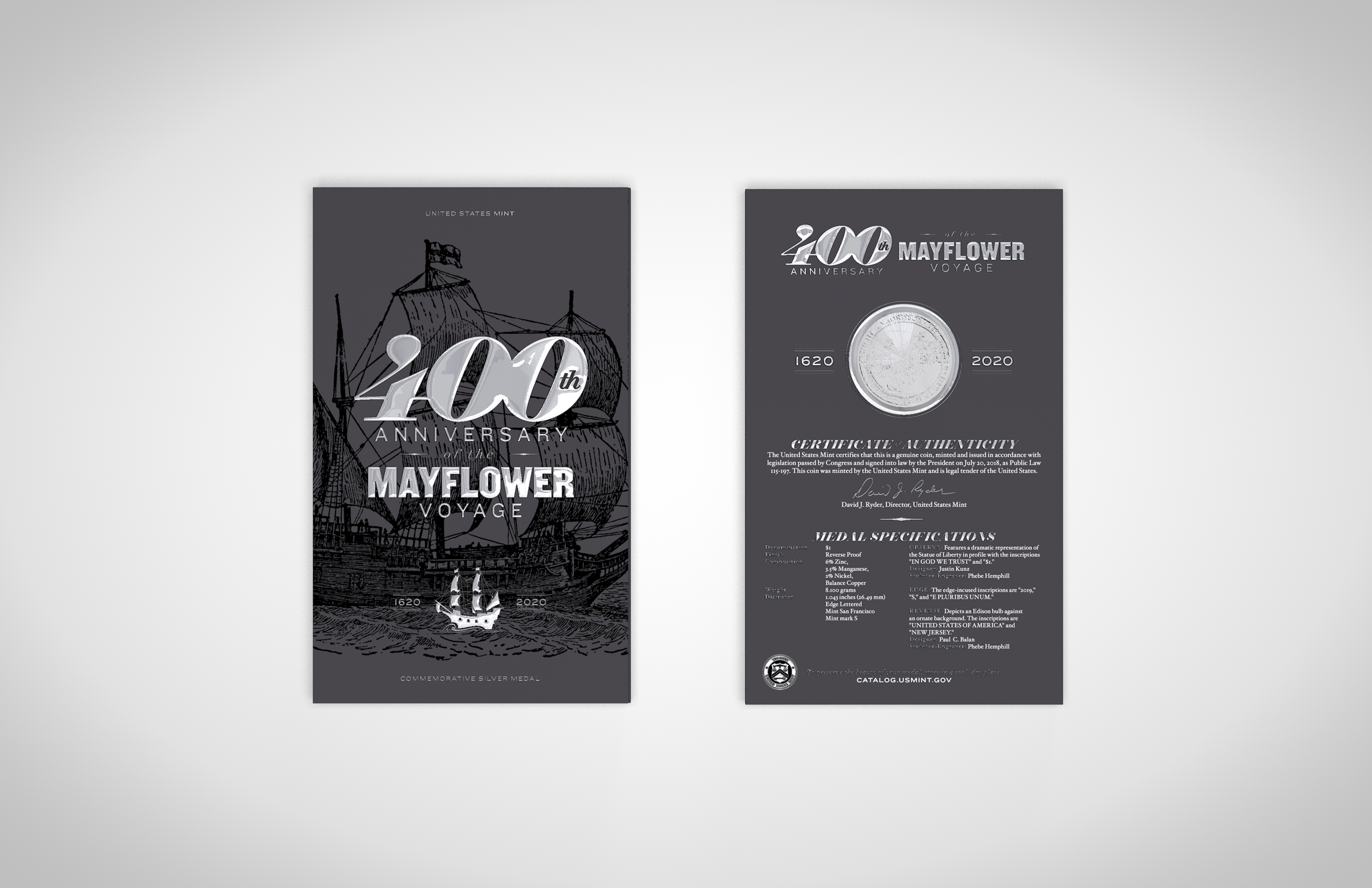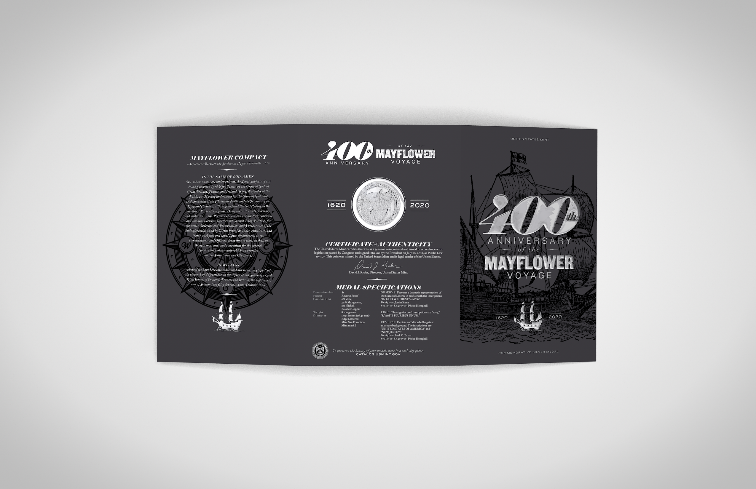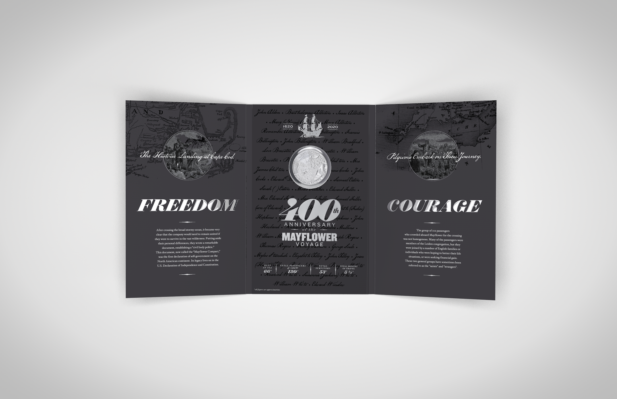 Phylum contacted Andon Guenther Design in 2019 to produce a coinfolio commemorating the 400th Anniversary of The Mayflower. We went back and forth on a few variations and ended with what you see below. This project was a lot of fun, and educational, as we re-learned all there is to know about the ship and the historical voyage, and used elements from our learnings in the final production piece.